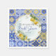 Diseño inspirado en el Mediterráneo con azulejos estilo costa de Amalfi italianos brillantes azules y amarillos con limones pintados a la acuarela y marco arqueado con brillo dorado falso.