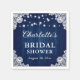 Elegantes toallas rústicas de color azul marino para la ducha de novia con un fondo rústico de madera adornado con luces de cuerda y encaje floral blanco.