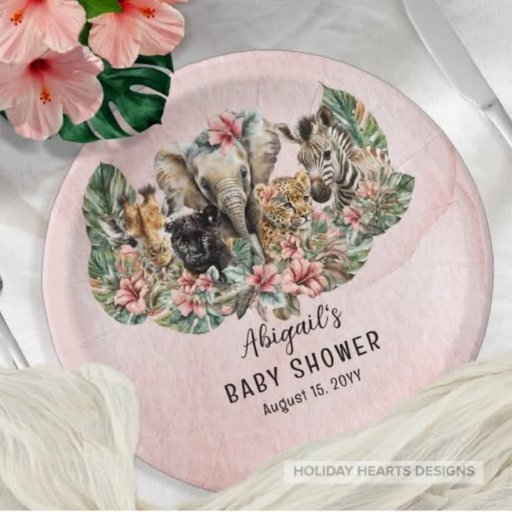 Un collage de animales bebés de la selva de safari silvestre dulce — jirafa, cebra, pantera, tigre y elefante — se esconden en un ambiente acogedor entre los hibiscos tropicales y la vegetación de la monstera en este diseño de Baby Shower. El fondo es una acuarela rosa degradado. Diseño compuesto por Holiday Hearts Designs.