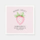 Servilleta de baby shower de fresa dulce. Con una fresa de acuarela sobre un fondo rosa. Este bonito diseño es perfecto para una niña. Personaliza la servilleta con el nombre de la futura madre y la fecha del baby shower.