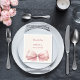 Un color de fondo marfil, crema. Decorado con un lazo rosa grande. Personalice y agregue el nombre y la fecha.