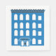 En el exterior del hotel azul, con numerosas ventanas. Este diseño parece realmente efectivo en estas servilletas de papel