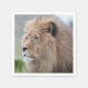 En la imagen, un león macho se para orgullosamente contra un fondo claro. Su majestuoso estilo enmarca su noble cara, exuberante fuerza y autoridad. A sus pies se encuentra una hoja verde vibrante, que simboliza la armonía entre el rey de las bestias y el mundo natural