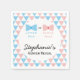 El género del patrón de triángulo azul y rosa revela con servilletas de papel de corbata de arco. El diseño presenta un patrón de triángulos azul y rosa y un círculo blanco en el centro con corbata de arco y texto personalizado.