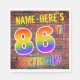 El frente de este emocionante y llamativo diseño de servilleta de papel con temática de cumpleaños, tiene un nombre de personalizable, y el mensaje "¡86º CUMPLEAÑOS!" con letras con un patrón de gradiente inspirado en el espectro multicolor del arcoiris, sobre un fondo inspirado en la pared de ladrillos. La apariencia está inspirada en el graffiti o arte callejero dibujado en una pared. Las servilletas de papel divertidas como esta podrían ser usadas en una fiesta de cumpleaños para alguien que está celebrando su cumpleaños 86. [~Z0000367]