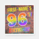 El frente de este diseño de servilleta de papel vibrante, divertido y llamativo, con temática de cumpleaños, tiene un nombre personalizado, y el mensaje "¡96º CUMPLEAÑOS!" con letras con un patrón de gradiente inspirado en el espectro multicolor del arcoiris, sobre un fondo inspirado en la pared de ladrillos. El estilo está inspirado en el grafiti o el arte callejero dibujado en una pared. Las servilletas de papel divertido como esta pueden ser usadas en una fiesta de cumpleaños que se lleva a cabo en honor del cumpleaños 96 de alguien. [~Z0000367]