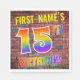 El frente de este emocionante y llamativo diseño de servilleta de papel con temática de cumpleaños, tiene un nombre personalizado, y el mensaje "¡15º CUMPLEAÑOS!" con letras con un patrón de gradiente inspirado en el espectro multicolor de los arcoíris, sobre un fondo inspirado en la pared de ladrillos. La decoración se inspira en el graffiti o arte callejero dibujado en una pared. Las servilletas de papel divertido como esta podrían ser usadas en una fiesta de cumpleaños que se realiza para honrar a alguien que está celebrando su décimo quinto cumpleaños. [~Z0000367]