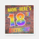 En el frente de este divertido, emocionante y llamativo diseño de pañuelos de papel con temática de cumpleaños, aparece un nombre personalizado, y el mensaje "18TH BIRTHDAY!" con letras con un patrón de gradiente inspirado en el espectro multicolor del arcoiris, sobre un fondo inspirado en la pared de ladrillos. El estilo está inspirado en el arte callejero o en los graffitis dibujados en la pared. Las servilletas de papel divertido como esta podrían ser usadas en una fiesta de cumpleaños que se lleva a cabo para celebrar el décimo octavo cumpleaños de alguien. [~Z0000367]