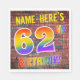 El frente de este emocionante, vibrante y divertido diseño de servilletas de papel con temática de cumpleaños cuenta con un nombre personalizado, y el mensaje "¡62º CUMPLEAÑOS!" con letras con un patrón de gradiente inspirado en el espectro multicolor del arcoiris, sobre un fondo inspirado en la pared de ladrillos. La decoración se inspira en el arte callejero o en los grafitis dibujados en una pared. Las servilletas de papel divertidas como esta podrían ser usadas en una fiesta de cumpleaños que se lleva a cabo para celebrar el 62 cumpleaños de alguien. [~Z0000367]