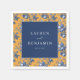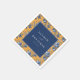 These wedding napkins feature a stunning design with a vibrant orange background adorned by intricate blue floral patterns, creating an elegant and timeless look. The central navy blue panel provides a sophisticated contrast, allowing for customizable text in a refined serif and cursive font combination that adds a touch of formality. Perfect for celebrating your special day, the harmonious blend of bold colors and delicate illustrations evokes a joyful and celebratory mood, making these napkins ideal for any formal wedding event.