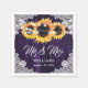 Rustic purple and sunflower wedding paper napkins featuring sunflowers, string lights and delicate floral lace on a rustic wood background.