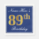 Este sencillo y elegante diseño de servilletas de papel presenta un mensaje como "Nombre-Acá es el 89º cumpleaños" (con el "89º" con un falso color dorado) dentro de un área cuadrada de color azul con un simple contorno fronterizo. El nombre se encuentra en un texto similar a un script de color blanco y se puede personalizar. Las servilletas como estas podrían ser usadas en una fiesta de cumpleaños para alguien que está celebrando su cumpleaños número ochenta y nueve. [~Z0000141]