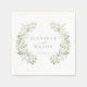 Revela elegancia con nuestras duraderas servilletas de papel botánico boda, adornadas con cautivadoras flores blancas acuarelas entadas con hojas verdes y hojas de eucalitus. Personalizadas con los nombres de la novia y del novio, estas servilletas de temática floral clásicas añaden un encanto particular a su romántico entorno de boda primaveral/veraniego.
