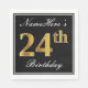 Este sencillo y elegante diseño de servilletas de papel presenta un mensaje como "NombreAquí es el vigésimo cuarto cumpleaños" (con el "24º" con un falso aspecto de color dorado) dentro de un área cuadrada de color negro con un simple contorno de borde. El nombre se encuentra en un texto similar a un script de color blanco y se puede personalizar. Las servilletas como estas podrían ser usadas en una fiesta de cumpleaños para alguien que está celebrando su vigésimo cuarto cumpleaños. [~Z0000136]