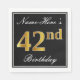 Este sencillo y elegante diseño de servilletas de papel presenta un mensaje como "Nombre-Acá es el cumpleaños 42" (con el "42" con un falso aspecto de color dorado) dentro de un área cuadrada de color negro con un simple contorno fronterizo. El nombre se encuentra en un texto similar a un script de color blanco y se puede personalizar. Las servilletas como estas podrían ser usadas en una fiesta de cumpleaños para alguien que esté celebrando su 42 cumpleaños. [~Z0000136]