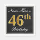 Este sencillo y elegante diseño de servilletas de papel presenta un mensaje como "Nombre: Este es el 46º cumpleaños" (con el "46º" con un falso aspecto de color dorado) dentro de un área cuadrada de color negro con un simple contorno fronterizo. El nombre está en un texto similar a un guión de color blanco y se puede personalizar. Las servilletas como estas podrían ser usadas en una fiesta de cumpleaños para alguien que está celebrando su 46º cumpleaños. [~Z0000136]