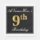Este sencillo y elegante diseño de servilletas de papel presenta un mensaje como "ANameHere's 9th Birthday" (con el "9th" con un falso color dorado) dentro de un área cuadrada de color negro con un simple contorno fronterizo. El nombre está en un texto similar a un guión de color blanco y se puede personalizar. Las servilletas como estas podrían ser usadas en una fiesta de cumpleaños para alguien que está celebrando su noveno cumpleaños. [~Z0000136]