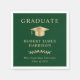 Elegantes servilletas verdes para la fiesta de graduación con una gorra de oro, "Graduado" y el nombre del graduado, el año escolar y de clase en tipografía clásica de los serif.