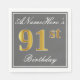 Este sencillo y elegante diseño de servilletas de papel presenta un mensaje como "ANameHere's 91st Birthday" (con el "91st" con un falso color dorado) dentro de un área cuadrada de color gris con un simple contorno fronterizo. El nombre está en un texto similar a un guión de color blanco y se puede personalizar. Las servilletas como estas podrían ser usadas en una fiesta de cumpleaños para alguien que está celebrando su cumpleaños noventa. [~Z0000191]