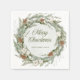 Estas impresionantes servilletas vacacionales cuentan con una guirnalda de Navidades con un elegante follaje botánico y conos de pino con flores blancas festivas. La caligrafía de escritura moderna dice "Feliz Navidad", y una sutil salpicadura de color verde salvia decora el centro de la corona.