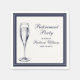 Elegancia intemporal para las celebraciones de jubilación Esta servilleta de retiro exuda elegancia formal con su fondo azul profundo y su centro blanco roto, ofreciendo un atractivo clásico para cualquier evento. La cuidada mezcla de guiones y tipos de letra serif complementa la sencillez general, mientras que un gráfico de champán de vidrio añade un toque de celebración. Ideal para fiestas corporativos o familiares, esta servilleta es fácilmente personalizable para su evento especial.