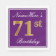 Este sencillo y elegante diseño de servilletas de papel presenta un mensaje como "NombreAquí es el 71º cumpleaños" (con el "71º" con un falso color dorado) dentro de un área cuadrada de color púrpura con un simple contorno fronterizo. El nombre está en un texto similar a un guión de color blanco y se puede personalizar. Las servilletas como estas podrían ser usadas en una fiesta de cumpleaños para alguien que está celebrando su cumpleaños número setenta. [~Z0000140]