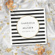 Con un clásico fondo de rayas en blanco y negro, estas elegantes servilletas de papel para bodas presentan un borde de lámina de oro falso que enmarca sus nombres y fecha especial en tipografía chic. Diseñado por Thisisnotme©