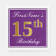 Este sencillo y elegante diseño de servilletas de papel presenta un mensaje como "Cumpleaños 15 de FirstName" (con el "15″ con un falso color dorado) dentro de un área cuadrada de color púrpura con un simple contorno de borde. El nombre se encuentra en un texto similar a un script de color blanco y se puede personalizar. Las servilletas como estas podrían ser usadas en una fiesta de cumpleaños para alguien que está celebrando su décimo quinto cumpleaños. [~Z0000140]
