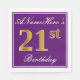 Este sencillo y elegante diseño de servilletas de papel presenta un mensaje como "ANameHere's 21st Birthday" (con el "21st" con un falso aspecto de color dorado) dentro de un área cuadrada de color púrpura con un simple contorno de borde. El nombre está en un texto similar a un guión de color blanco y se puede personalizar. Las servilletas como estas podrían ser usadas en una fiesta de cumpleaños para alguien que esté celebrando su 21º cumpleaños. [~Z0000140]
