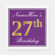 Este sencillo y elegante diseño de servilletas de papel presenta un mensaje como "NombreAquí es el cumpleaños 27" (con el "27" con un falso aspecto de color dorado) dentro de un área cuadrada de color púrpura con un simple contorno fronterizo. El nombre está en un texto similar a un guión de color blanco y se puede personalizar. Las servilletas como estas podrían ser usadas en una fiesta de cumpleaños para alguien que está celebrando su cumpleaños veintisiete. [~Z0000140]