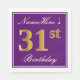 Este sencillo y elegante diseño de servilletas de papel presenta un mensaje como "NameHere's 31st Birthday" (con el "31st" con un falso aspecto de color dorado) dentro de un área cuadrada de color púrpura con un simple contorno fronterizo. El nombre se encuentra en un texto similar a un script de color blanco y se puede personalizar. Las servilletas como estas podrían ser usadas en una fiesta de cumpleaños para alguien que está celebrando su cumpleaños número treinta. [~Z0000140]