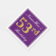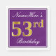 Este sencillo y elegante diseño de servilletas de papel presenta un mensaje como "NombreAquí es el cumpleaños número 53" (con el "53" con un falso aspecto de color dorado) dentro de un área cuadrada de color púrpura con un simple contorno fronterizo. El nombre está en un texto similar a un guión de color blanco y se puede personalizar. Las servilletas como estas podrían ser usadas en una fiesta de cumpleaños para alguien que esté celebrando su cincuenta tercer cumpleaños. [~Z0000140]