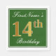 Este sencillo y elegante diseño de servilletas de papel presenta un mensaje como "Cumpleaños 14 de los Primeros" (con el "14″ con un falso color dorado) dentro de un área cuadrada de color verde con un simple contorno fronterizo. El nombre está en un texto similar a un guión de color blanco y se puede personalizar. Las servilletas como estas podrían ser usadas en una fiesta de cumpleaños para alguien que está celebrando su decimocuarto cumpleaños. [~Z0000137]