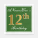 Este sencillo y elegante diseño de servilletas de papel presenta un mensaje como "ANameHere's 12th Birthday" (con el "12th" con un falso color dorado) dentro de un área cuadrada de color verde con un simple contorno fronterizo. El nombre se encuentra en un texto similar a un script de color blanco y se puede personalizar. Las servilletas como estas podrían ser usadas en una fiesta de cumpleaños para alguien que está celebrando su duodécimo cumpleaños. [~Z0000137]