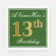 Este sencillo y elegante diseño de servilletas de papel presenta un mensaje como "ANameHere's 13th Birthday" (con el "13th" con un falso color dorado) dentro de un área cuadrada de color verde con un simple contorno fronterizo. El nombre se encuentra en un texto similar a un script de color blanco y se puede personalizar. Las servilletas como estas podrían ser usadas en una fiesta de cumpleaños para alguien que está celebrando su decimotercer cumpleaños. [~Z0000137]