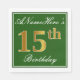 Este sencillo y elegante diseño de servilletas de papel presenta un mensaje como "ANameHere's 15th Birthday" (con el "15th" con un falso color dorado) dentro de un área cuadrada de color verde con un simple contorno fronterizo. El nombre se encuentra en un texto similar a un script de color blanco y se puede personalizar. Las servilletas como estas podrían ser usadas en una fiesta de cumpleaños para alguien que está celebrando su décimo quinto cumpleaños. [~Z0000137]