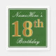 Este sencillo y elegante diseño de servilletas de papel presenta un mensaje como "NombreAquí es el 18º cumpleaños" (con el "18º" con un falso color dorado) dentro de un área cuadrada de color verde con un simple contorno fronterizo. El nombre está en un texto similar a un guión de color blanco y se puede personalizar. Las servilletas como estas podrían ser usadas en una fiesta de cumpleaños para alguien que está celebrando su decimoctavo cumpleaños. [~Z0000137]