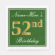 Este sencillo y elegante diseño de servilletas de papel presenta un mensaje como "Nombre-Acá es el cumpleaños número 52" (el "52" tiene un falso color dorado) dentro de un área cuadrada de color verde con un simple contorno fronterizo. El nombre está en un texto similar a un guión de color blanco y se puede personalizar. Las servilletas como estas podrían ser usadas en una fiesta de cumpleaños para alguien que esté celebrando su cincuenta segundo cumpleaños. [~Z0000137]