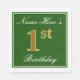 Este sencillo y elegante diseño de servilletas de papel presenta un mensaje como "Nombre-Aquí es el primer cumpleaños" (con el "primero" con un falso color dorado) dentro de un área cuadrada de color verde con un simple contorno fronterizo. El nombre está en un texto similar a un guión de color blanco y se puede personalizar. Las servilletas como estas podrían ser usadas en una fiesta de cumpleaños para alguien que está celebrando su primer cumpleaños. [~Z0000137]