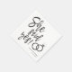 Una servilleta divertida y única con letra de guión personalizada específicamente para la cena o fiesta de compromiso. Cuenta con las palabras "¡Ella dijo que sí!" con anillos de boda al lado. Debajo y encima de esto están los nombres de la novia y el novio y la fecha de compromiso o boda.