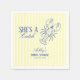 Servilletas elegantes para ducha de novia costera con rayas amarillas mantequilla y tipografía azul refinada. Una langosta de arte de línea encantadora agrega un toque caprichoso de playa, mientras que la mezcla de tipografías modernas y vintage crea un diseño atemporal y fresco. Perfecto para celebrar el amor con sofisticación costera.