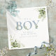 Es una servilleta para baby shower de niño que presenta una elegante tipografía azul polvoriento y hermoso follaje botánico verde. Diseñado por Thisisnotme©