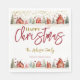Una preciosa servilleta de Navidades. Este glamoroso diseño dorado y rojo de vacaciones cuenta con una escena callejera nevada con casas y árboles. Fácil de personalizar con sus propios detalles de fiesta o cena.