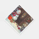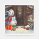 Esta es una adorable servilleta de papel de Navidades que presenta una escena de un lindo muñeco de nieve con regalos en la puerta principal de una casa en un estilo de acuarela vintage.