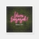 Letrero de neón rosa inspirado en "Estamos comprometidos" sobre fondo de vegetación de boj con texto y borde blancos.