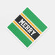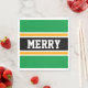 Este diseño deportivo, de vacaciones para Navidades, presenta texto deportivo MERRY dentro de una banda negra resaltada con pinstripes blancas y amarillas contra rayas exteriores de color verde brillante. El texto de este diseño se puede personalizar.