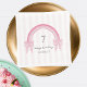 La temática de cumpleaños de Coquette femenina presenta el ilustracion de un arcoiris rosado con arcos rosados en los extremos. Fondo de banda rosa claro.