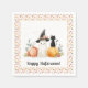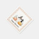 Una divertida servilleta de Halloween con un fantasma de la acuarela en un gorra de brujas, un gato negro sentado en una calabaza y suave vegetación otoñal. Con un borde de caída salpicado de tonos cálidos, este diseño añade un toque espeluznante-bonito a las celebraciones de truco o de regalo.