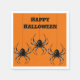 servilletas naranjas con imágenes de arañas y las palabras "Feliz Halloween"