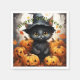Servilletas de papel lindas con un gatito negro en Halloween con un sombrero negro de bruja con su trasero sobresaliendo, sentado entre calabazas felices.